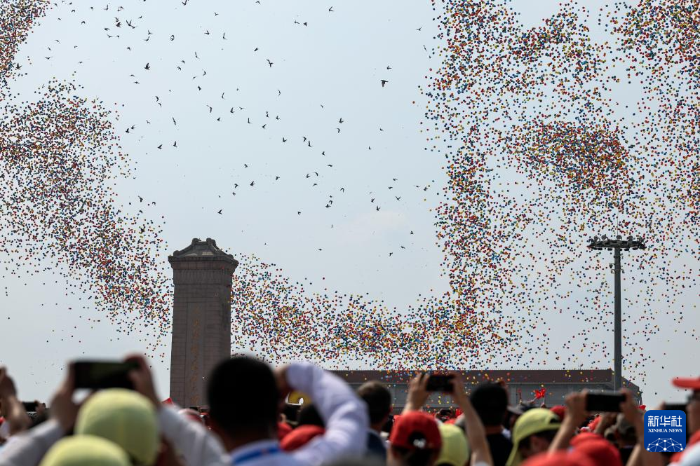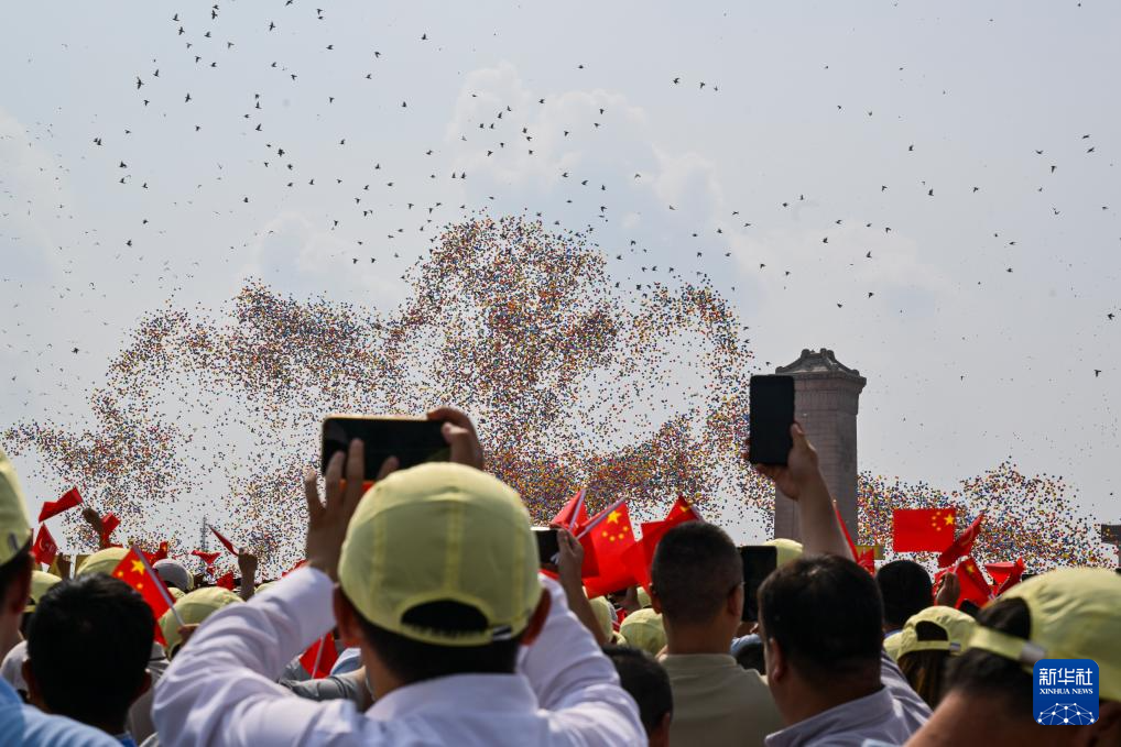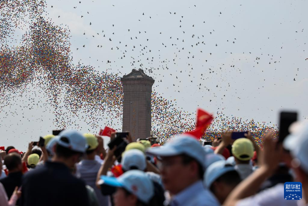 9月3日,紀(jì)念中國人民抗日戰(zhàn)爭暨世界反法西斯戰(zhàn)爭勝利80周年大會在北京隆重舉行。這是觀眾拍攝紀(jì)念大會現(xiàn)場放飛氣球和鴿子。