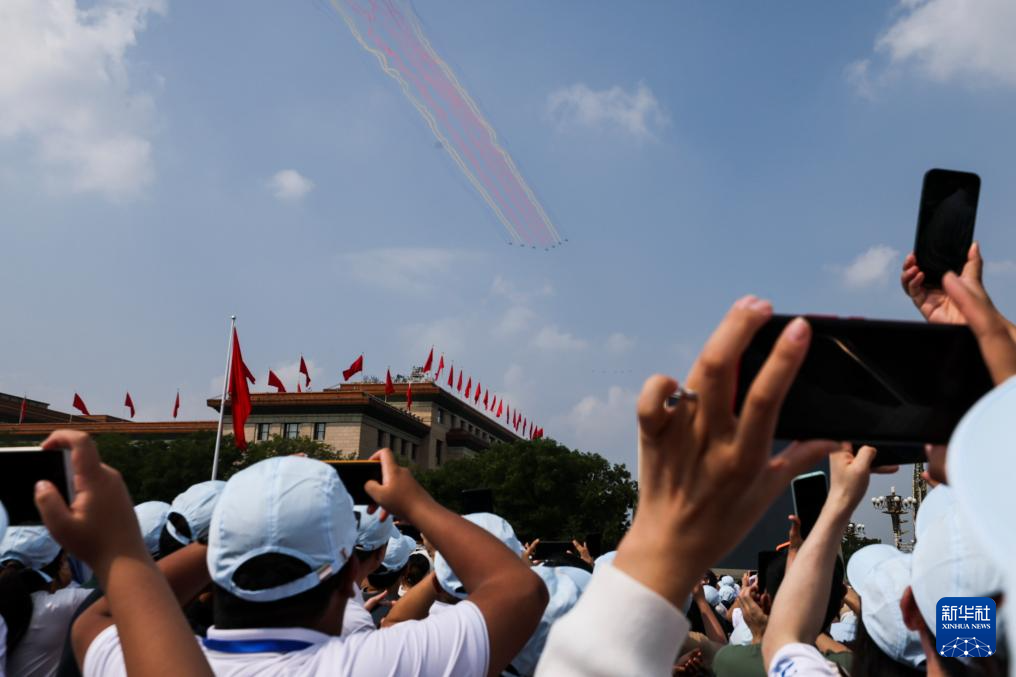 9月3日,紀(jì)念中國人民抗日戰(zhàn)爭暨世界反法西斯戰(zhàn)爭勝利80周年大會在北京隆重舉行。這是觀眾拍攝教練機梯隊接受檢閱。