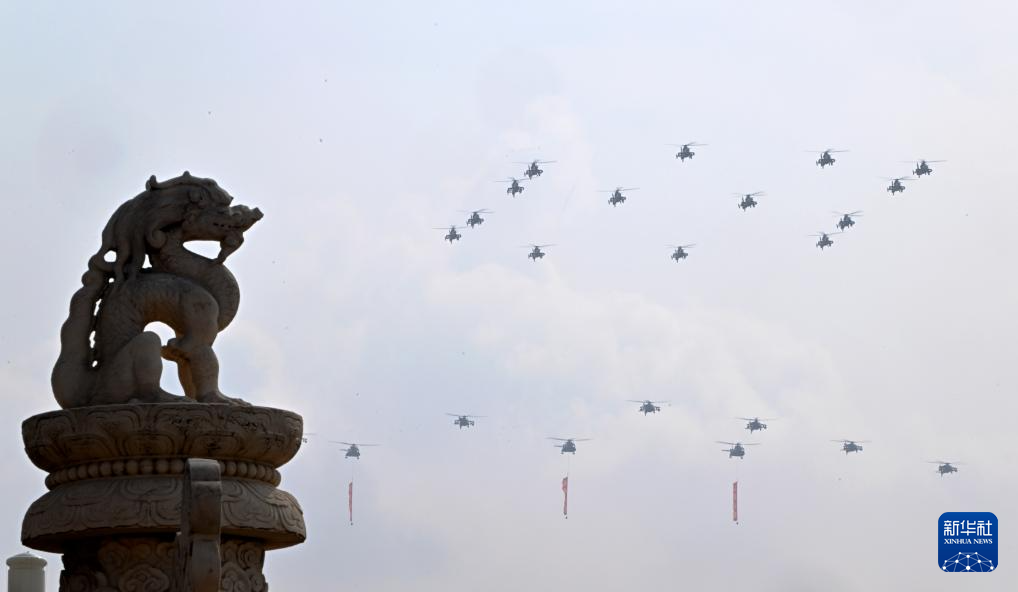 9月3日,紀(jì)念中國(guó)人民抗日戰(zhàn)爭(zhēng)暨世界反法西斯戰(zhàn)爭(zhēng)勝利80周年大會(huì)在北京隆重舉行。這是空中護(hù)旗梯隊(duì)通過天安門廣場(chǎng)。
