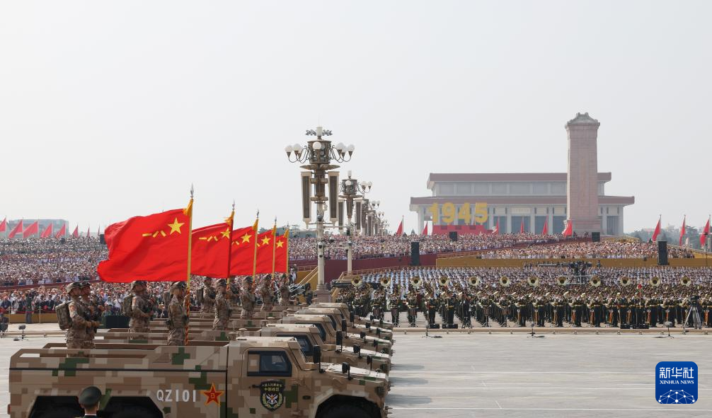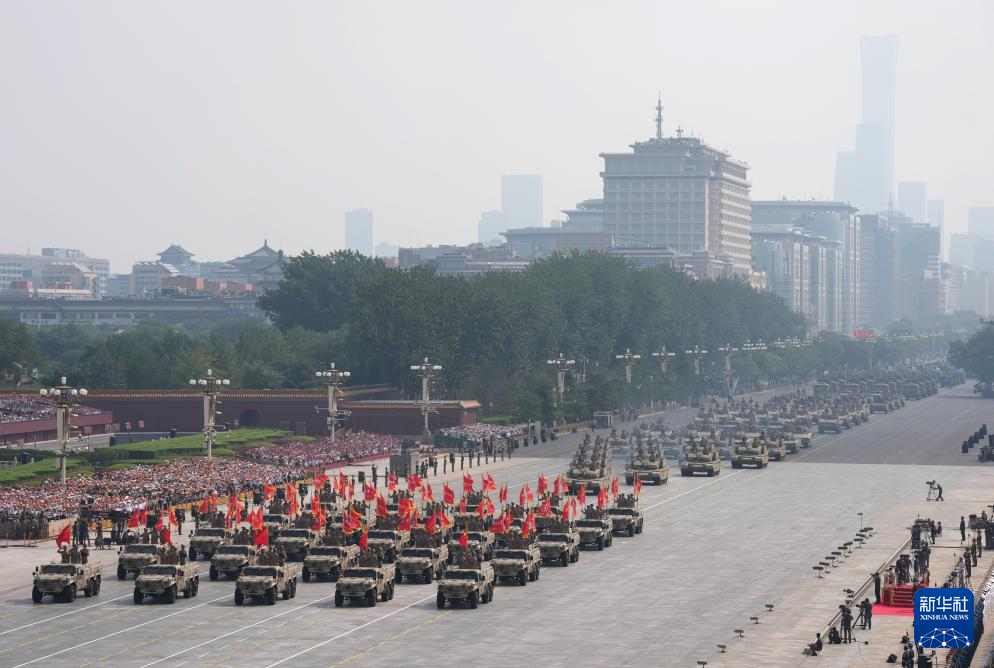 9月3日,紀(jì)念中國(guó)人民抗日戰(zhàn)爭(zhēng)暨世界反法西斯戰(zhàn)爭(zhēng)勝利80周年大會(huì)在北京隆重舉行。這是戰(zhàn)旗方隊(duì)和裝備方隊(duì)接受檢閱。