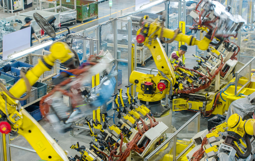 浙江省湖州市長(zhǎng)興經(jīng)濟(jì)技術(shù)開發(fā)區(qū)的長(zhǎng)興地通汽車部件有限公司技術(shù)人員操控工業(yè)機(jī)器人生產(chǎn)新能源汽車配件(無(wú)人機(jī)照片,2025年10月9日攝)。新華社發(fā)(譚云俸 攝)