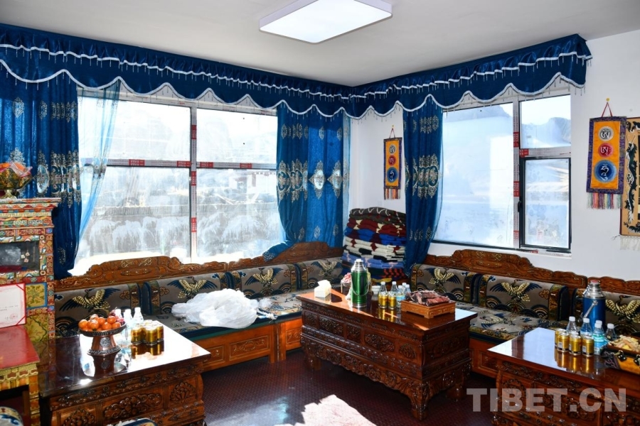 他的妻子次仁拉宗坐在門(mén)前編織毛線,談及新家,她有說(shuō)不完的話?!斑@個(gè)新家我們裝修花了3萬(wàn)多元,家具都是從定日縣城買的,也有一些是從舊家里搬出來(lái)的,等過(guò)完這個(gè)年我們還想著把現(xiàn)在的大白墻再裝飾一下?!痹诘┰龅募依?,墻面掛滿了孩子們的獎(jiǎng)狀,三個(gè)孩子中,大女兒在西藏大學(xué)讀書(shū),二女兒讀高一,最小的孩子即將進(jìn)入幼兒園。