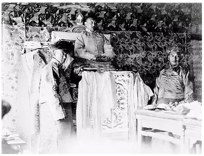 圖為1935年,九世班禪額爾德尼·曲吉尼瑪(中)在內(nèi)蒙古各地為僧眾祈禱祝福 圖片來源:中國之聲公眾號