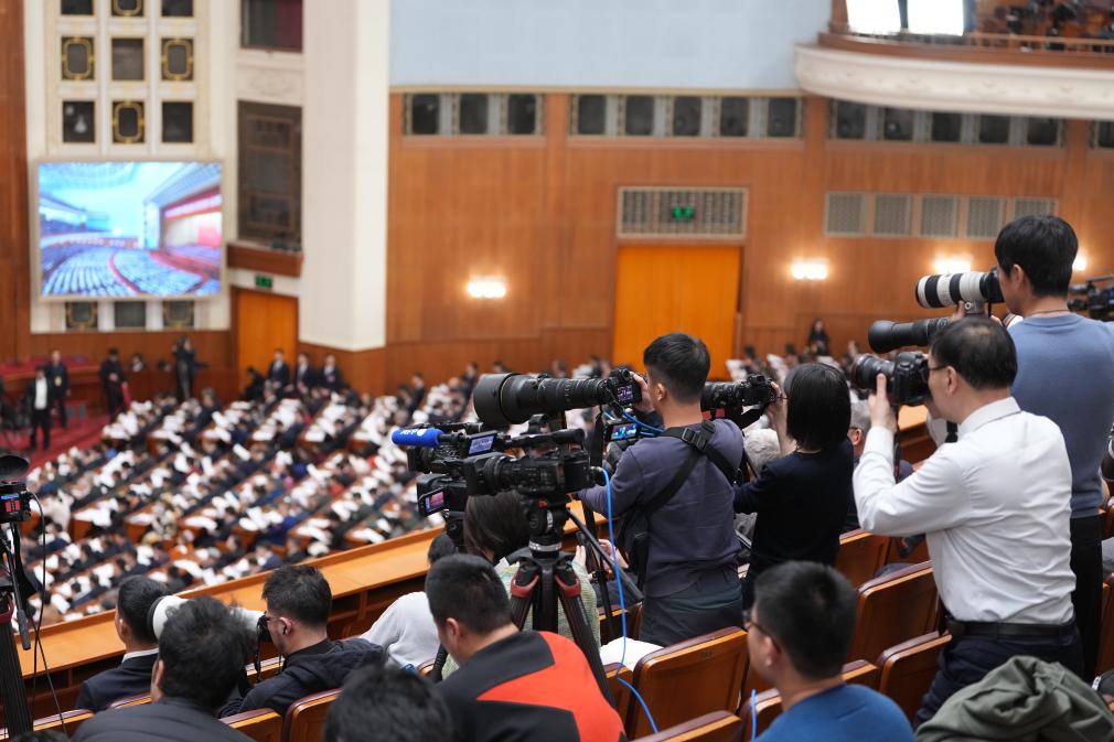 3月8日,十四屆全國人大三次會議在北京人民大會堂舉行第二次全體會議。這是記者在會場采訪。新華社記者 陳曄華 攝