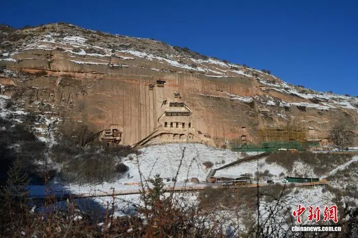 圖為崖壁上的千年石窟在白雪映襯下更顯古樸滄桑。戴文昌 攝