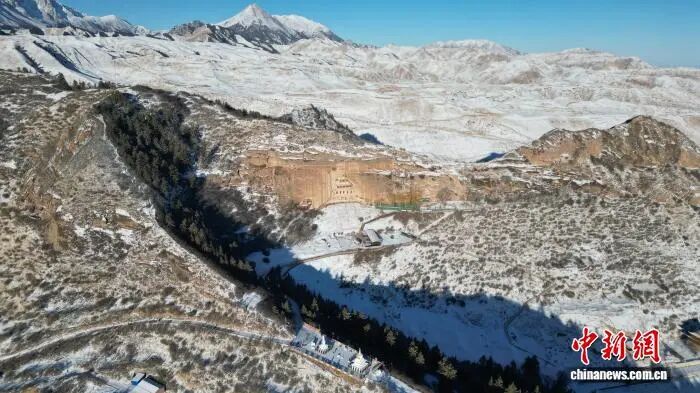 2025年12月22日,航拍下的馬蹄寺石窟群銀裝素裹。戴文昌 攝