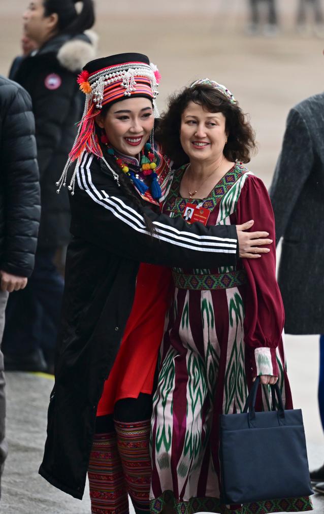 3月4日,中國(guó)人民政治協(xié)商會(huì)議第十四屆全國(guó)委員會(huì)第四次會(huì)議在北京人民大會(huì)堂開(kāi)幕。這是楊鈺尼委員(左)與木合拜爾·阿布都爾委員一起步入會(huì)場(chǎng)。