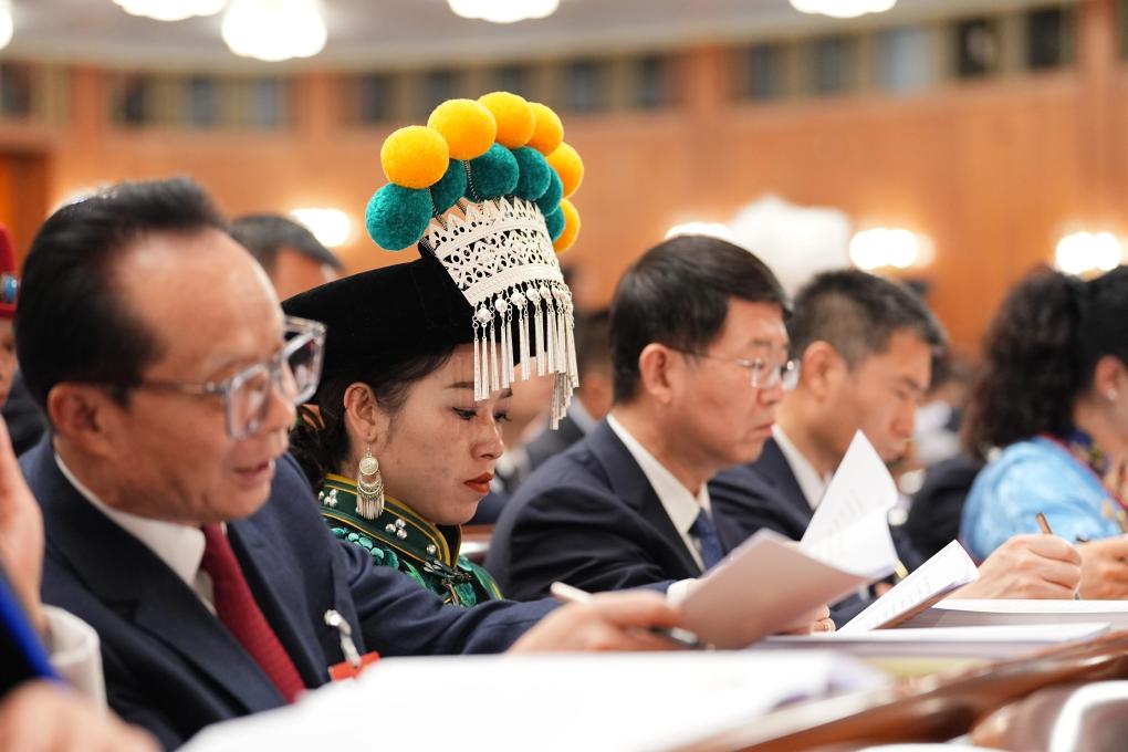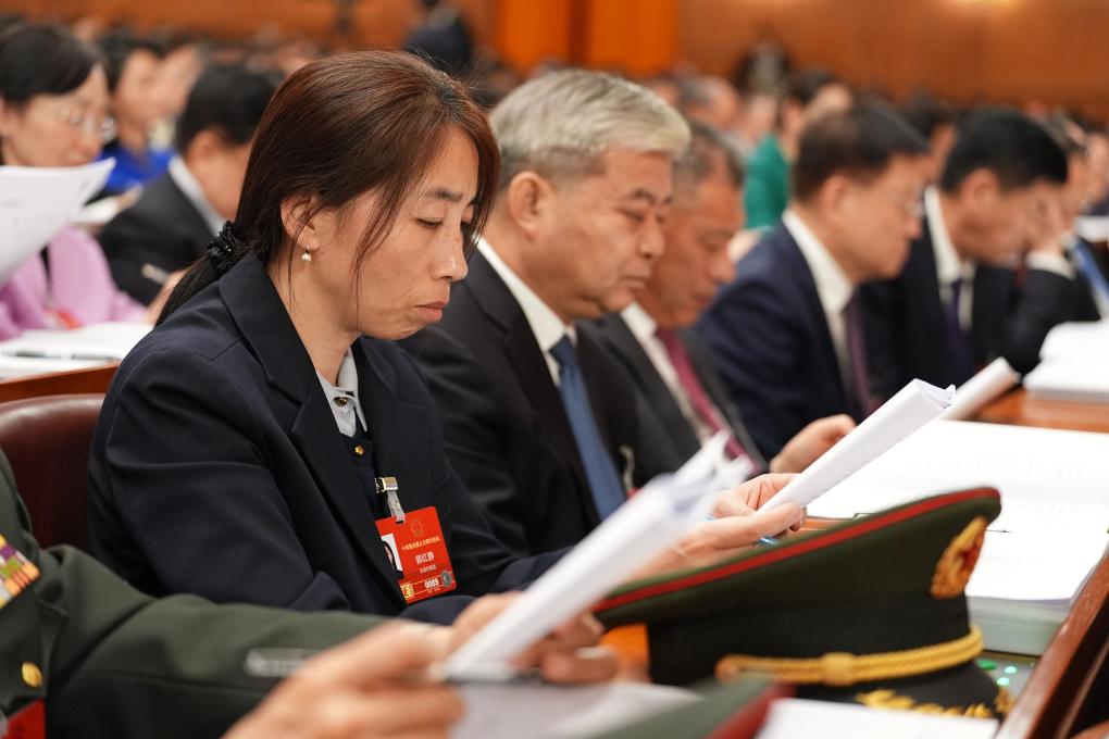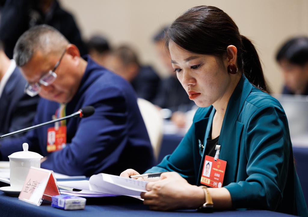 3月6日,金瑞瑞代表在駐地參加分組審議。 新華社記者 金立旺 攝