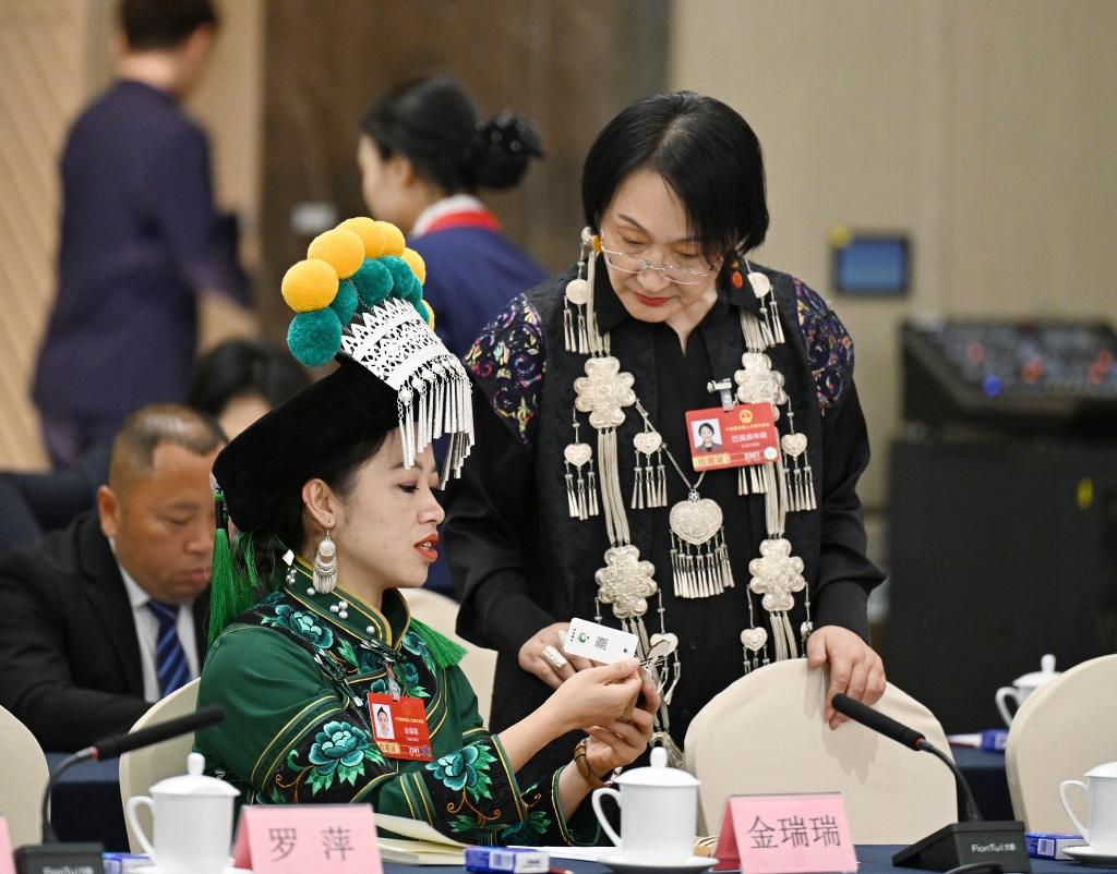 3月7日,金瑞瑞代表(前左)在十四屆全國(guó)人大四次會(huì)議云南代表團(tuán)開(kāi)放團(tuán)組會(huì)議前與另一位代表交流。新華社記者 程婷婷 攝