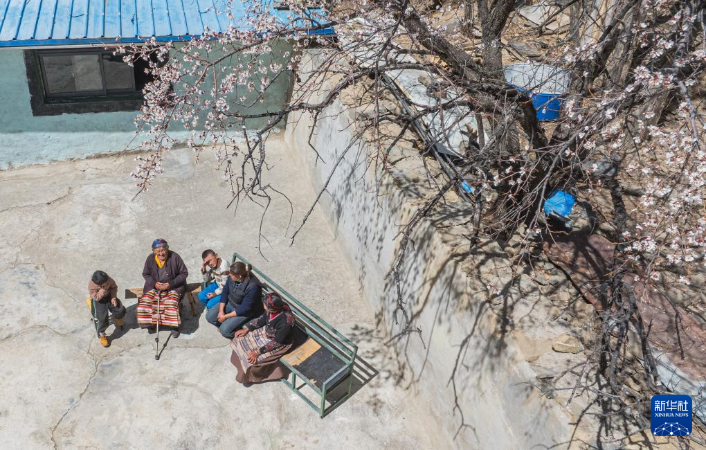 3月26日,次仁桑姆(左二)和晚輩在宗卡村家中的院子里聊天(無人機照片)。新華社記者 丁增尼達(dá) 攝